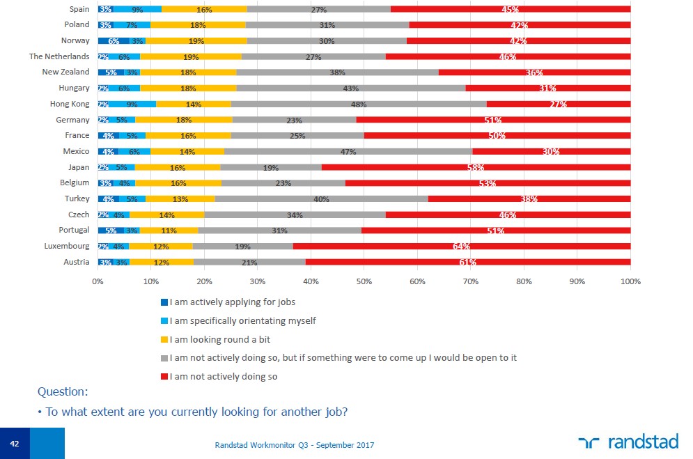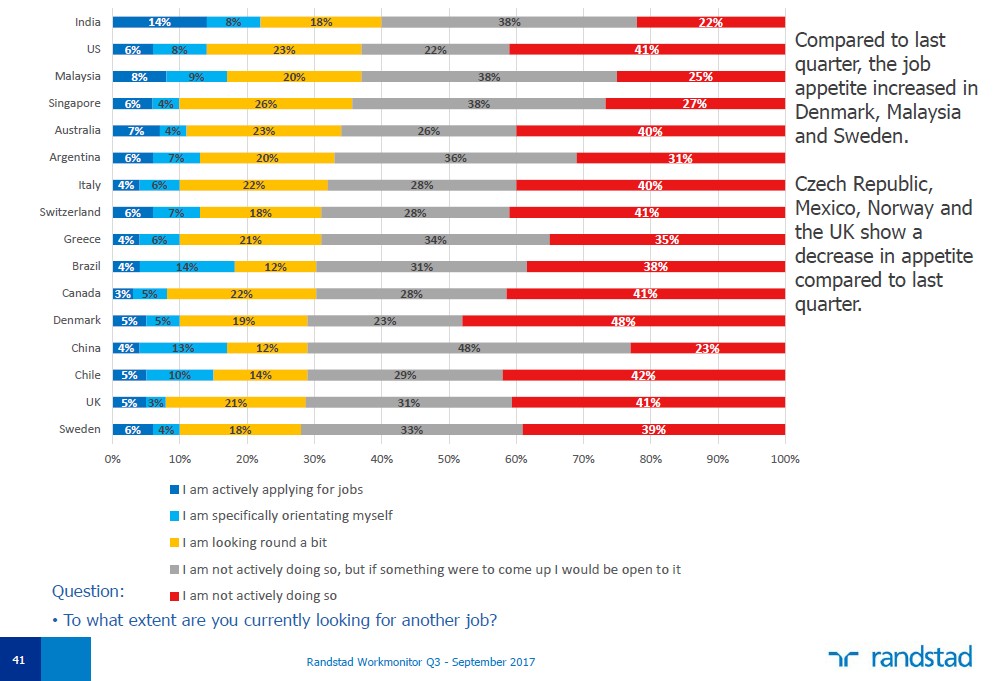 Z průzkumu vyplynulo, že velmi spokojeno se stávajícím zaměstnavatelem je 19 % českých zaměstnanců, celkem spokojeno pak 48 %. Nespokojenost vyjádřilo pouze 5 % respondentů (oproti téměř 9 % v předchozím čtvrtletí). „Rostoucí spokojenost zaměstnanců se zaměstnavateli souvisí s extrémně nízkou mírou nezaměstnanosti a nedostatkem kvalitních pracovníků, která vede zaměstnavatele ke zvyšování platů, rozšiřování zaměstnaneckých benefitů, podpoře jejich rozvoje, novinkám v péči o stávající zaměstnance, důrazu na dobré pracovní prostředí atd.,“ komentuje Hana Púllová, ředitelka české pobočky společnosti Randstad. Míra spokojenosti zaměstnanců se svými zaměstnavateli přitom roste se stupněm dosaženého vzdělání respondentů. Pokud je o obory, tak nejvíce nespokojených zaměstnanců je v automobilovém průmyslu (20 %) a v potravinářské výrobě (20 %).