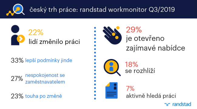 Z nejnovějšího globálního průzkumu Workmonitor personálně poradenské společnosti Randstad vyplynulo, že v uplynulých šesti měsících změnilo zaměstnání 21,7 % Čechů. Další čtvrtina lidí si aktuálně jinou práci buď aktivně hledá (6,7 %), nebo se po zajímavých pracovních příležitostech u jiného zaměstnavatele poohlíží (18,3 %). Další téměř třetina zaměstnanců (29 %) v průzkumu uvedla, že je otevřená zajímavým pracovním nabídkám, pokud by se objevily. Zhruba 13 % dotazovaných uvedlo, že cítí silnou potřebu začít dělat něco úplně jiného než dosud.