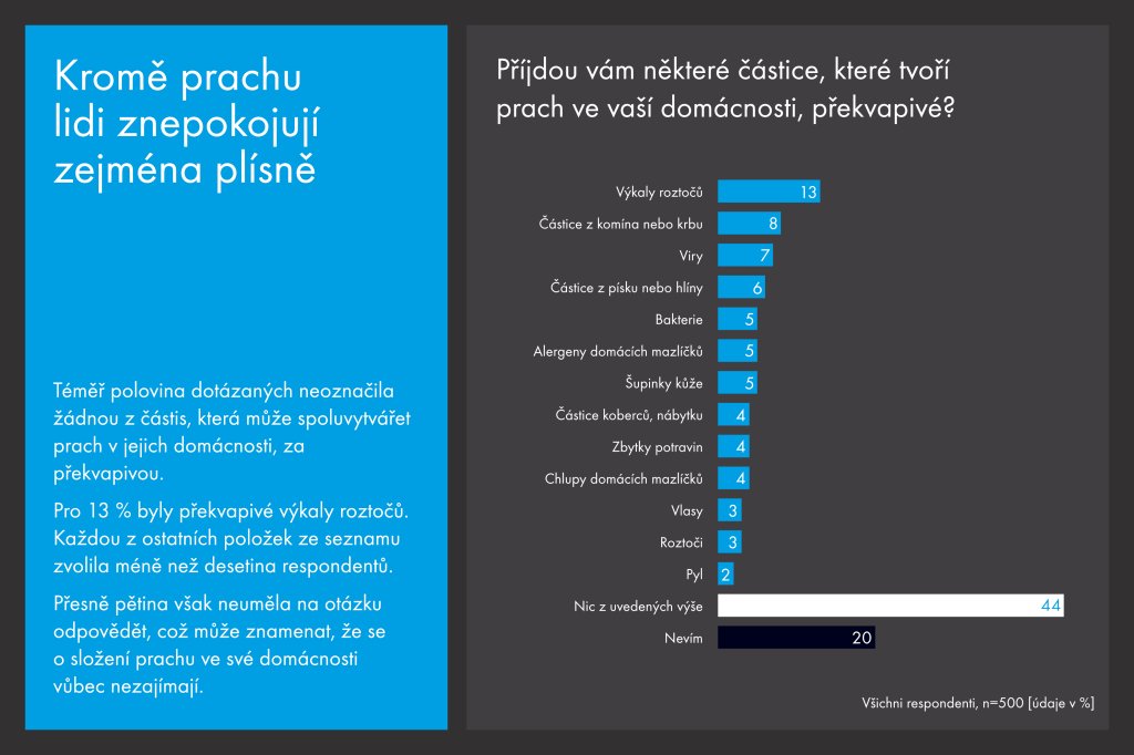 Průzkum provedený pro společnost Dyson zjistil, že pětina respondentů neuměla odpovědět na otázku, jaké částice tvořící prach jim připadají překvapivé. To může znamenat, že se o složení prachu ve své domácnosti vůbec nezajímají. Částice z komína nebo krbu překvapily 8 % respondentů, 7 % pak bylo překvapeno, když zjistili, že se v domovním prachu mohou vyskytovat viry. Nejvíce překvapující součástí domácího prachu se však staly výkaly z roztočů (13 %). Pravdou přitom je, že výkaly roztočů v domácím prachu jsou celosvětově považovány za nejdůležitější spouštěče alergenních onemocnění.