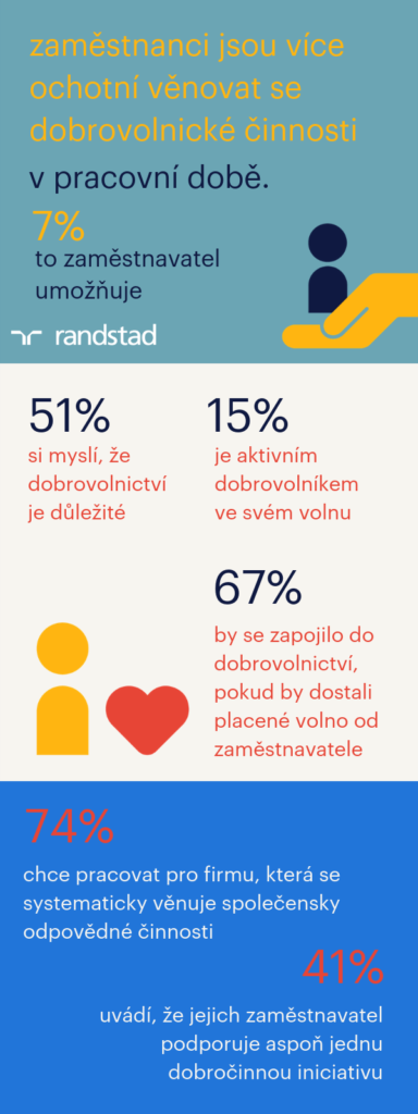 Pouze 7 % českých zaměstnanců ovšem od svého zaměstnavatele placené volno na dobrovolnickou práci ve prospěch nějaké charitativní činnosti či organizace dostane. „V Randstadu chceme naše zaměstnance motivovat k tomu, aby se dobrovolnictví věnovali pravidelně, proto jim poskytujeme 8 placených hodin ročně, které mohou na dobrovolné aktivity využít. Zároveň spouštíme i online platformu, kde uveřejňujeme nabídky na zapojení se do dobrovolnických akcí a stejnou možnost pozvat takto své kolegy má kdokoli ze zaměstnanců,“ konstatuje Alžběta Honsová. Dalších 8 % respondentů průzkumu Randstad Workmonitor pak uvedlo, že v rámci pracovní doby vykonávají dobrovolnickou práci pro organizaci vybranou zaměstnavatelem. „V obou případech jde u nás opět o nejnižší podíl ze všech zkoumaných zemí. Celosvětový průměr činí 19 %, respektive 18 %,“ dodává Alžběta Honsová.