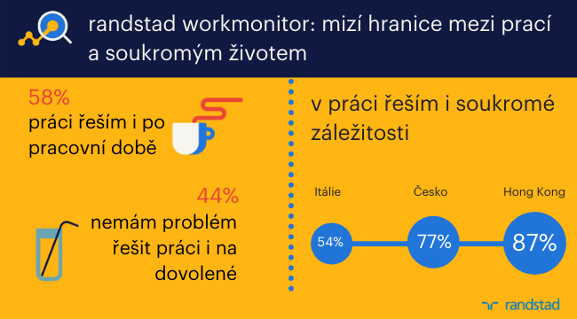 Prolínání pracovního a soukromého času funguje i obráceně. Z průzkumu totiž vyplynulo, že více než tři čtvrtiny (77 %) českých pracovníků občas během své pracovní doby řeší i soukromé záležitosti. ČR v tomto parametru patří nad průměr, který je celosvětově 67 %, přičemž nejvíce se soukromé záležitosti řeší během pracovní doby v Hongkongu (87 %) a nejméně v Itálii (54 %). „Pozorujeme, že se postupně stírá jasná hranice mezi pracovní dobou a osobním volnem, a to především u kvalifikovanějších a samostatnějších pozic, které to umožňují,“ komentuje Alžběta Honsová, marketingová manažerka české pobočky společnosti Randstad, a dodává: „Zkušenosti ukazují, že je to pozitivní jev jak pro zaměstnavatele, který tímto způsobem dosáhne vyšší efektivity, tak i pro zaměstnance, kteří mají větší pocit svobody a nemusí řešit problémy s vymýšlením dovolené kvůli návštěvě úřadů, třídních schůzek a podobně. Do značné míry k tomuto jevu přispěl i fenomén práce z domu, respektive odkudkoliv, který se stále více rozmáhá.“