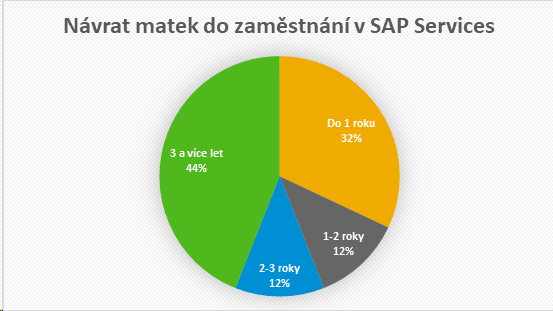 „Podle našich údajů už dávno neplatí, že se matky snaží s dětmi zůstávat doma co nejdéle, například v uplynulém roce se nám třetina matek vrátila do jednoho roku od nástupu na mateřskou dovolenou,“ říká Lenka Pospíšilová, HR Business Partner ve společnosti SAP Services, a dodává: „Vnímáme to jako sílící trend. Mnohé ženy si uvědomují, že příliš dlouhá rodičovská dovolená by mohla negativně ovlivnit jejich kariérní příležitosti, a proto vítají, když jim zaměstnavatel nabídne takové podmínky, aby zvládly péči o malé dítě i práci.“ V SAP Services mají například možnost pracovat na zkrácený úvazek, hojně využívají také práci z domova včetně možnosti flexibilně si v rámci dne rozložit pracovní dobu.