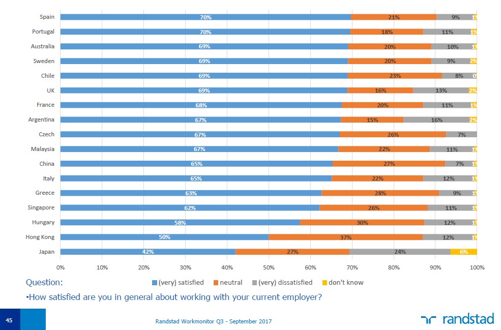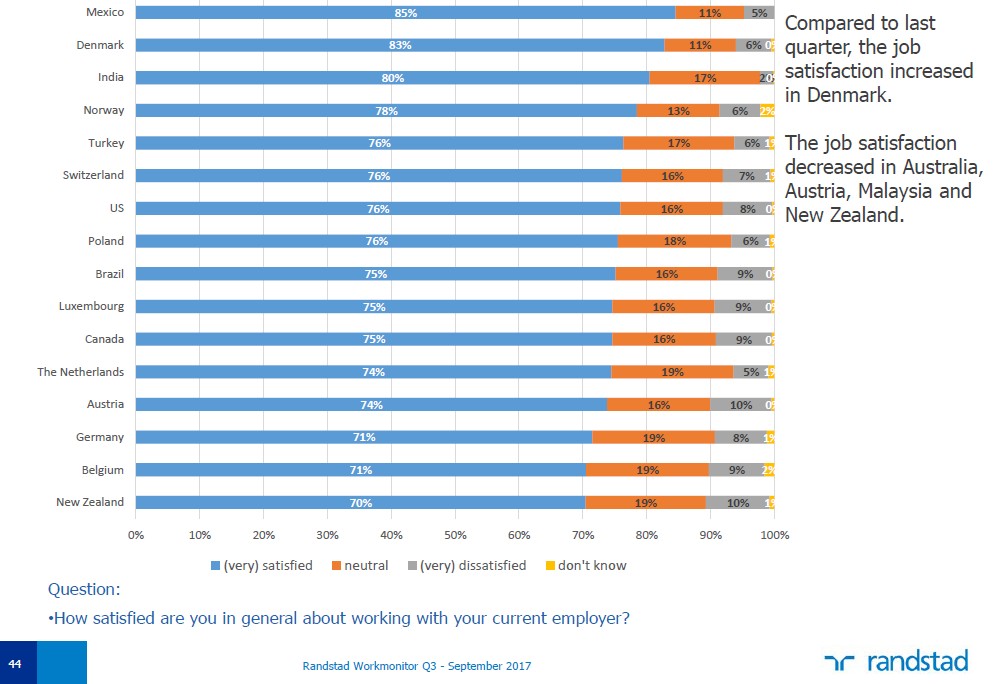 Z průzkumu vyplynulo, že velmi spokojeno se stávajícím zaměstnavatelem je 19 % českých zaměstnanců, celkem spokojeno pak 48 %. Nespokojenost vyjádřilo pouze 5 % respondentů (oproti téměř 9 % v předchozím čtvrtletí). „Rostoucí spokojenost zaměstnanců se zaměstnavateli souvisí s extrémně nízkou mírou nezaměstnanosti a nedostatkem kvalitních pracovníků, která vede zaměstnavatele ke zvyšování platů, rozšiřování zaměstnaneckých benefitů, podpoře jejich rozvoje, novinkám v péči o stávající zaměstnance, důrazu na dobré pracovní prostředí atd.,“ komentuje Hana Púllová, ředitelka české pobočky společnosti Randstad. Míra spokojenosti zaměstnanců se svými zaměstnavateli přitom roste se stupněm dosaženého vzdělání respondentů. Pokud je o obory, tak nejvíce nespokojených zaměstnanců je v automobilovém průmyslu (20 %) a v potravinářské výrobě (20 %).