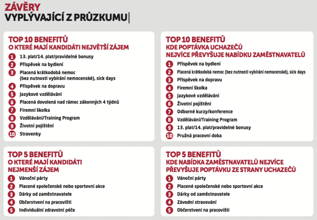 Zajímavé je, že mezi dělnickými profesemi se pomalu začínají prosazovat i benefity dříve běžně nabízené v kancelářském prostředí. Z průzkumu například vyplynulo, že mezi dělníky silně roste zájem o jazykové kurzy, nejrůznější formy firemního vzdělávání, vyhrazený čas na inovace anebo tzv. sick days, tedy krátkodobé placené zdravotní volno. Velmi žádaná je i firemní školka a nejrůznější formy flexibility práce (pružná pracovní doba, možnost nadpracovat si hodiny, maximálně dvojsměnný provoz).