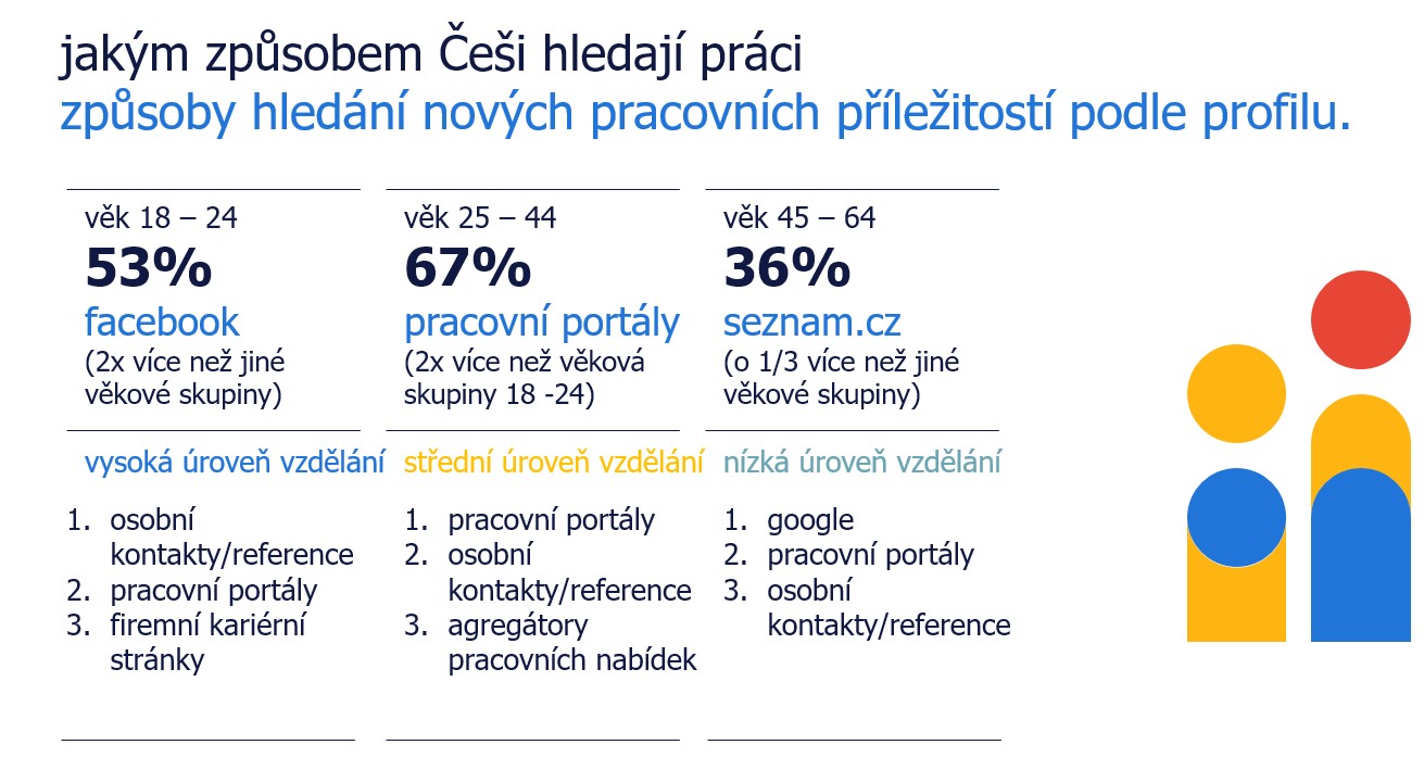 Způsob hledání práce se liší i dle věku. Internetové vyhledávače využívají nejčastěji lidé ve věku 18 – 24 let. Na pracovních portálech je nejaktivnější věková skupina 25-44 let a uchazeči o práci ve věku 45-64 let nejvíce hledají na seznam.cz.