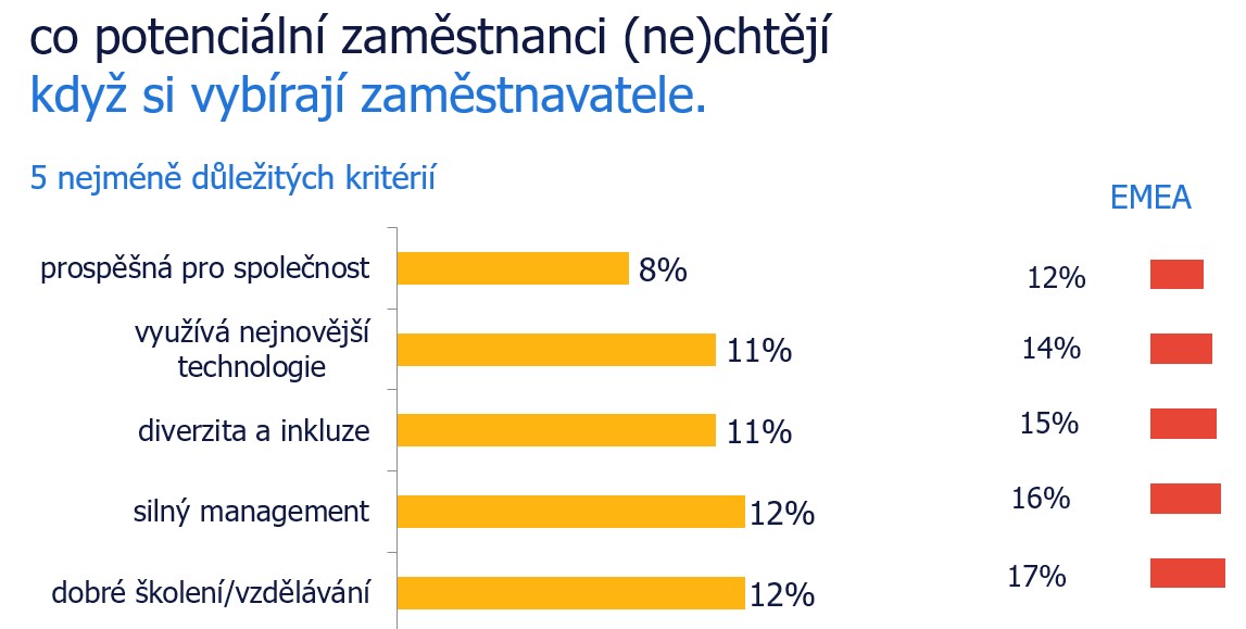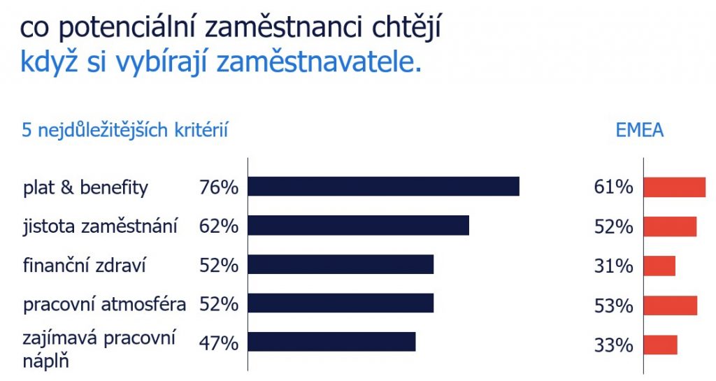 „Pozitivní pověst a firemní kultura fungují u kandidátů jako první hledisko, dle kterého třídí pracovní nabídky. O konkrétním zaměstnavateli se pak rozhodují na základě dalších kritérií, z nichž nejdůležitější představuje stále finanční ohodnocení,“ vysvětluje Alžběta Honsová a dodává, že mzdu považují čeští kandidáti za důležitější aspekt než jinde v regionu EMEA.
