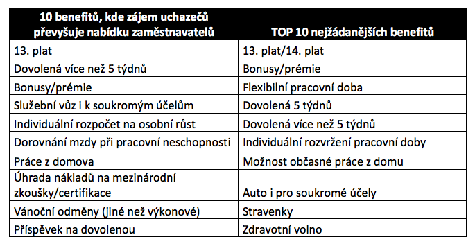 I když velmi nízká nezaměstnanost a boj o pracovníky probíhající napříč celým trhem vede zaměstnavatele k vylepšování balíčku poskytovaných nefinančních benefitů, stále se jejich nabídka rozchází s poptávkou. Například 13. plat zaujímá v českém žebříčku populárních benefitů první příčku, jde ovšem o výhodu, u které poptávka zaměstnanců nejvíce převyšuje nabídku zaměstnavatelů.